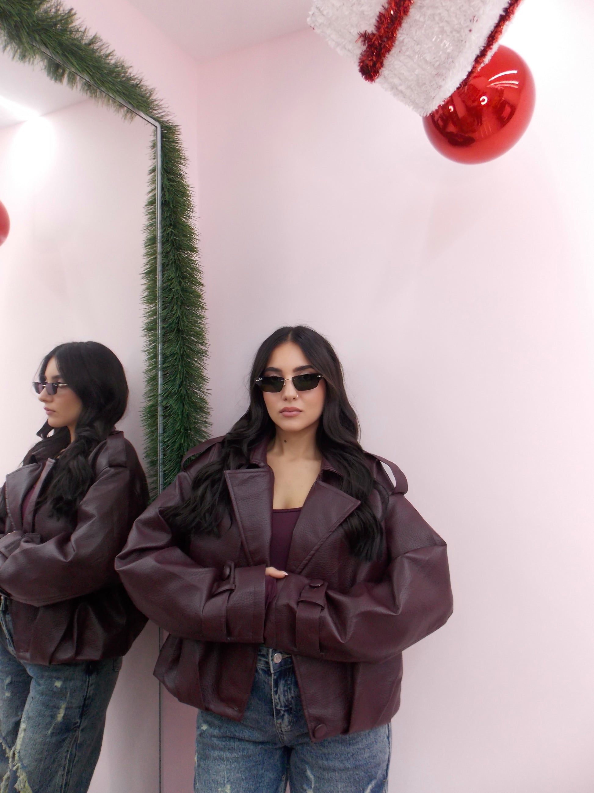 Bomber in ecopelle martellata. Foderato internamente, veste da taglia XS a taglia L.