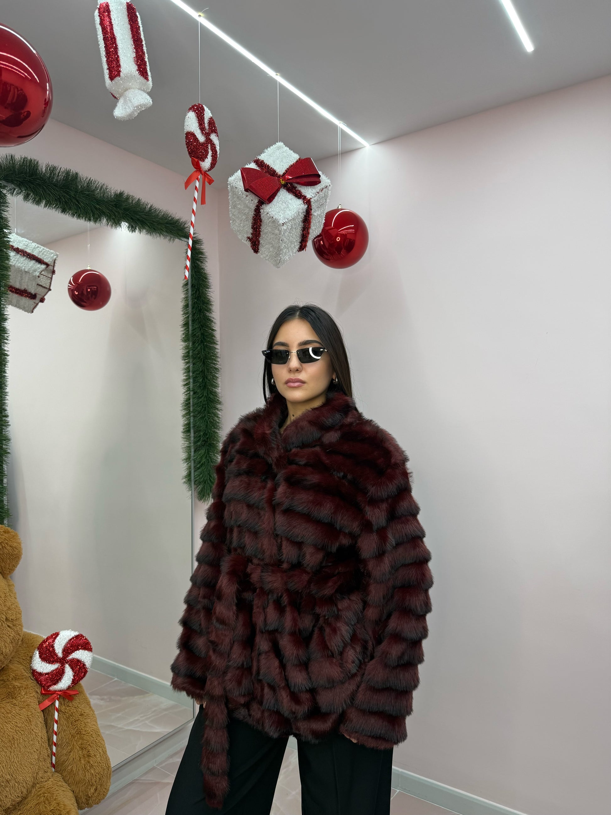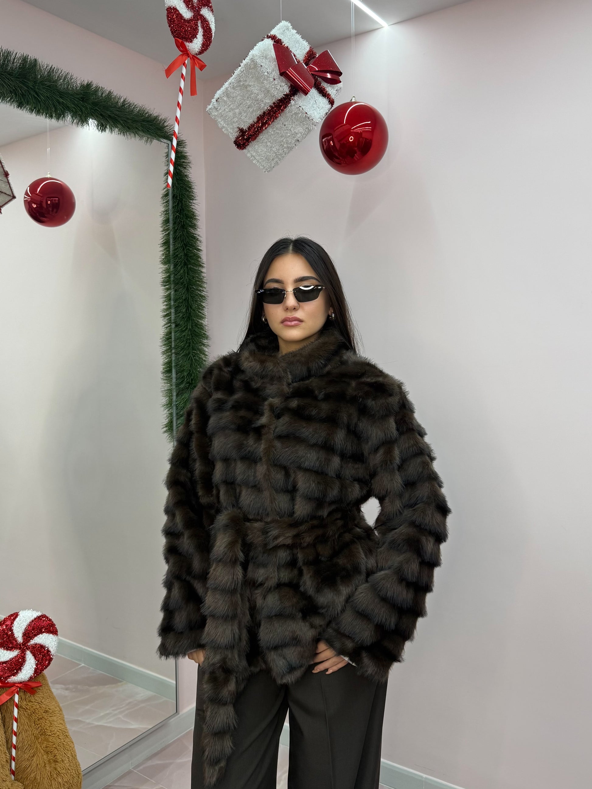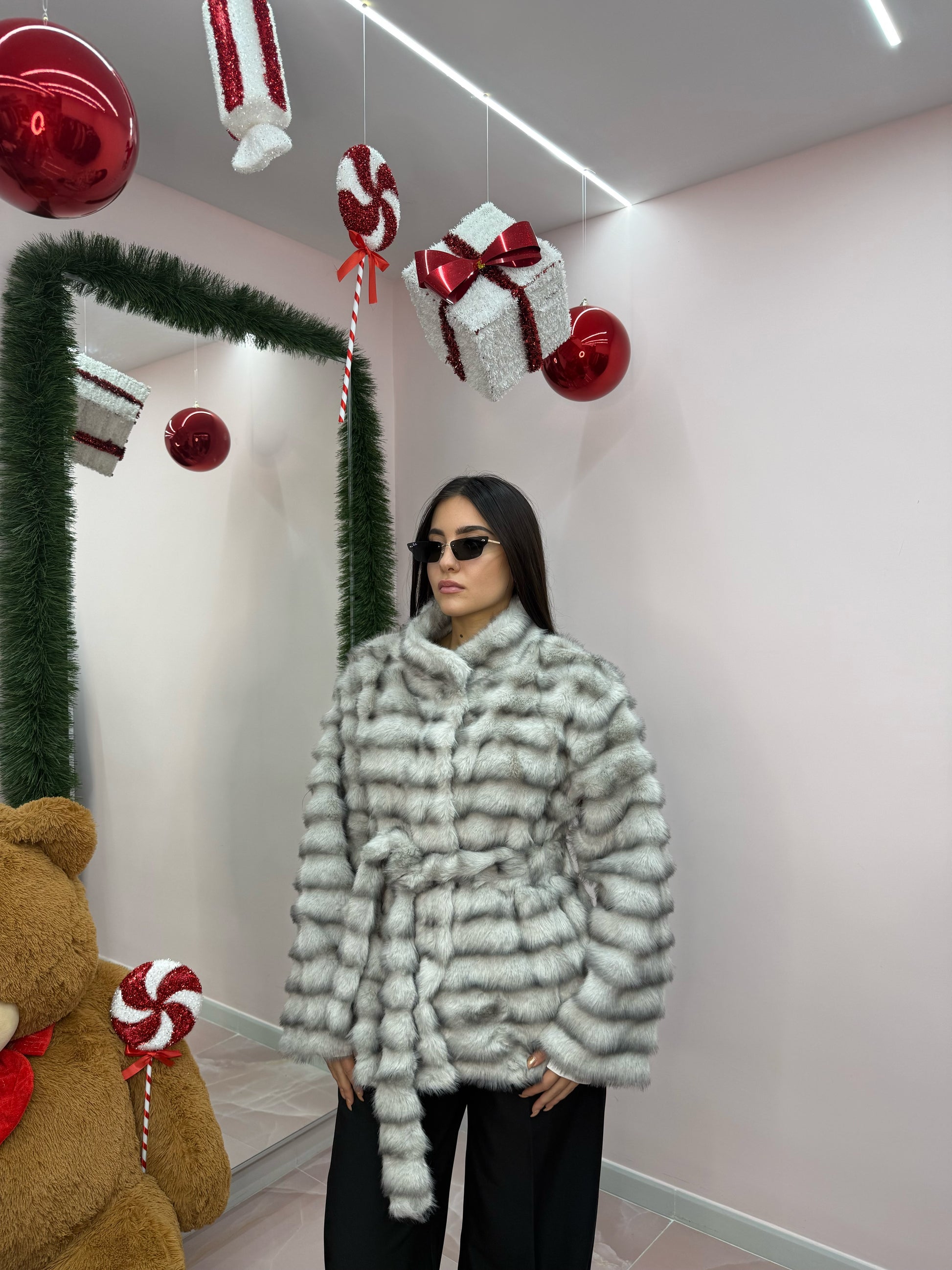 Taglia unica, veste da taglia XS a taglia XL. Interno foderato , bottoni, cinturino in vita in pelliccia.