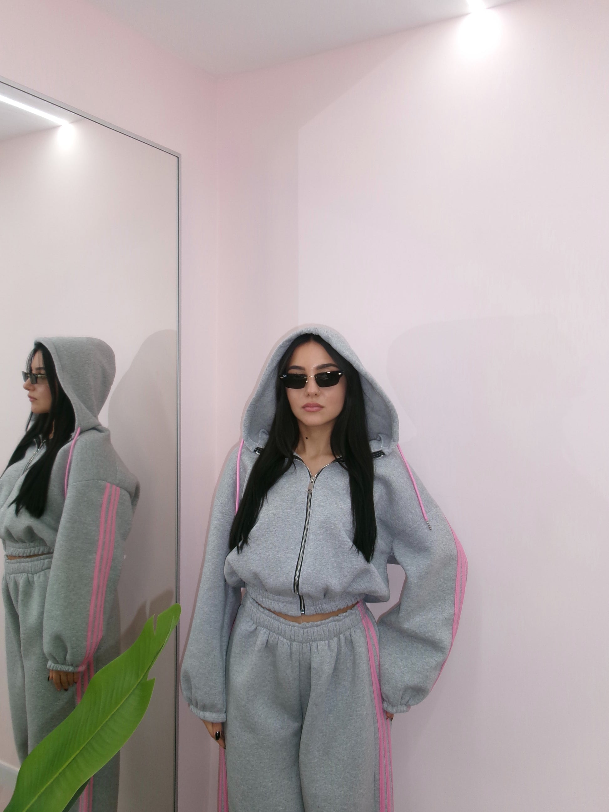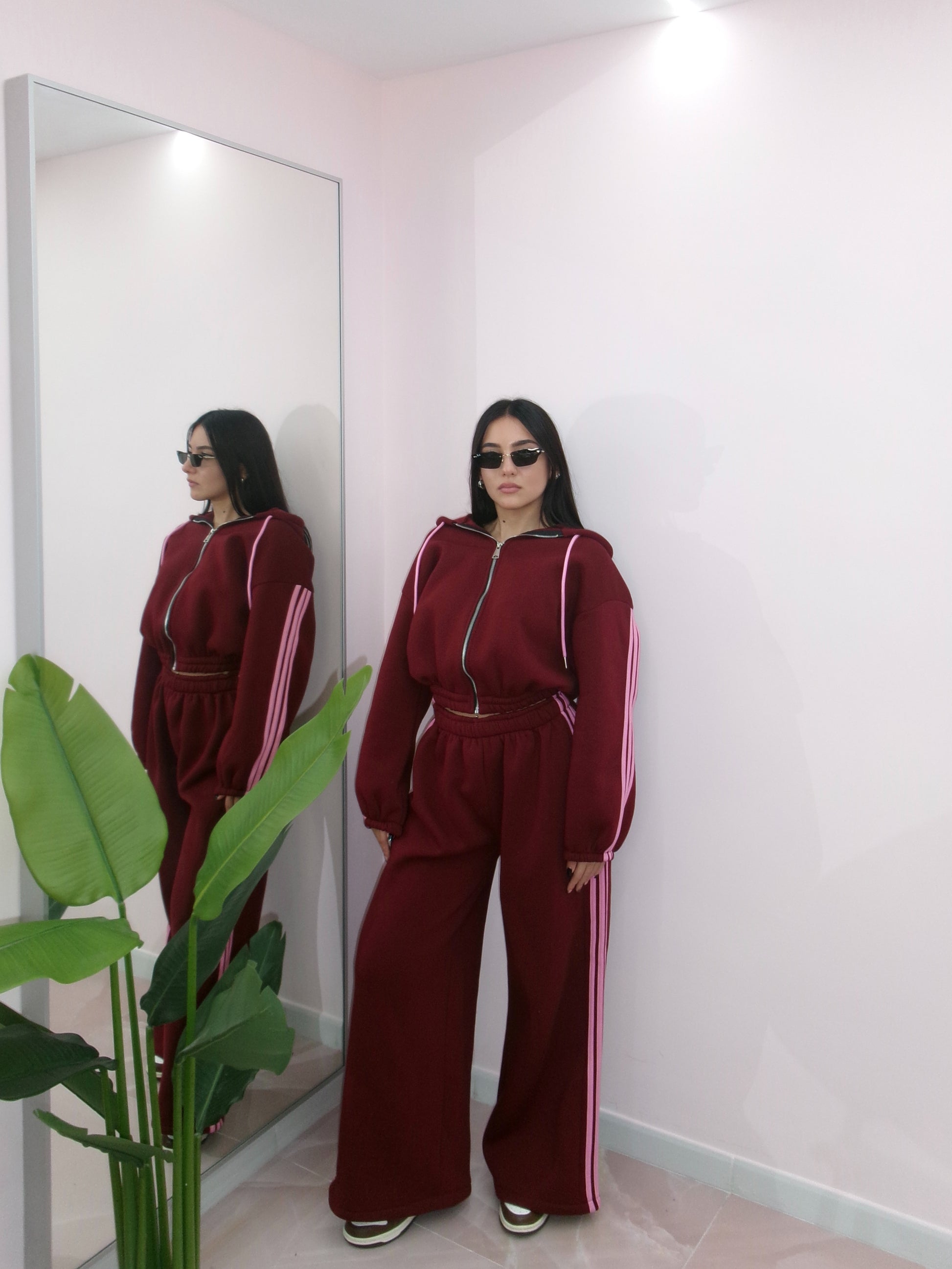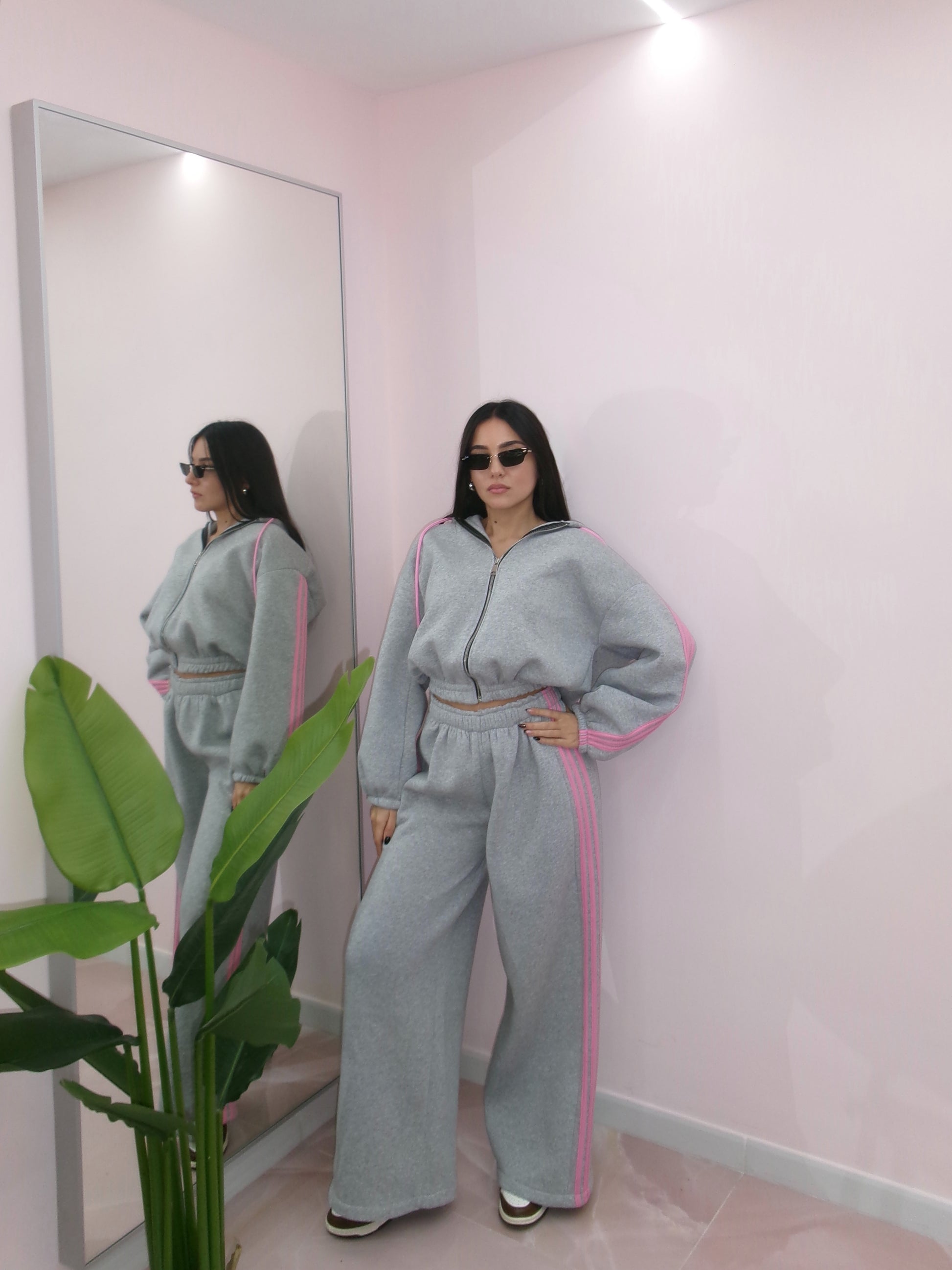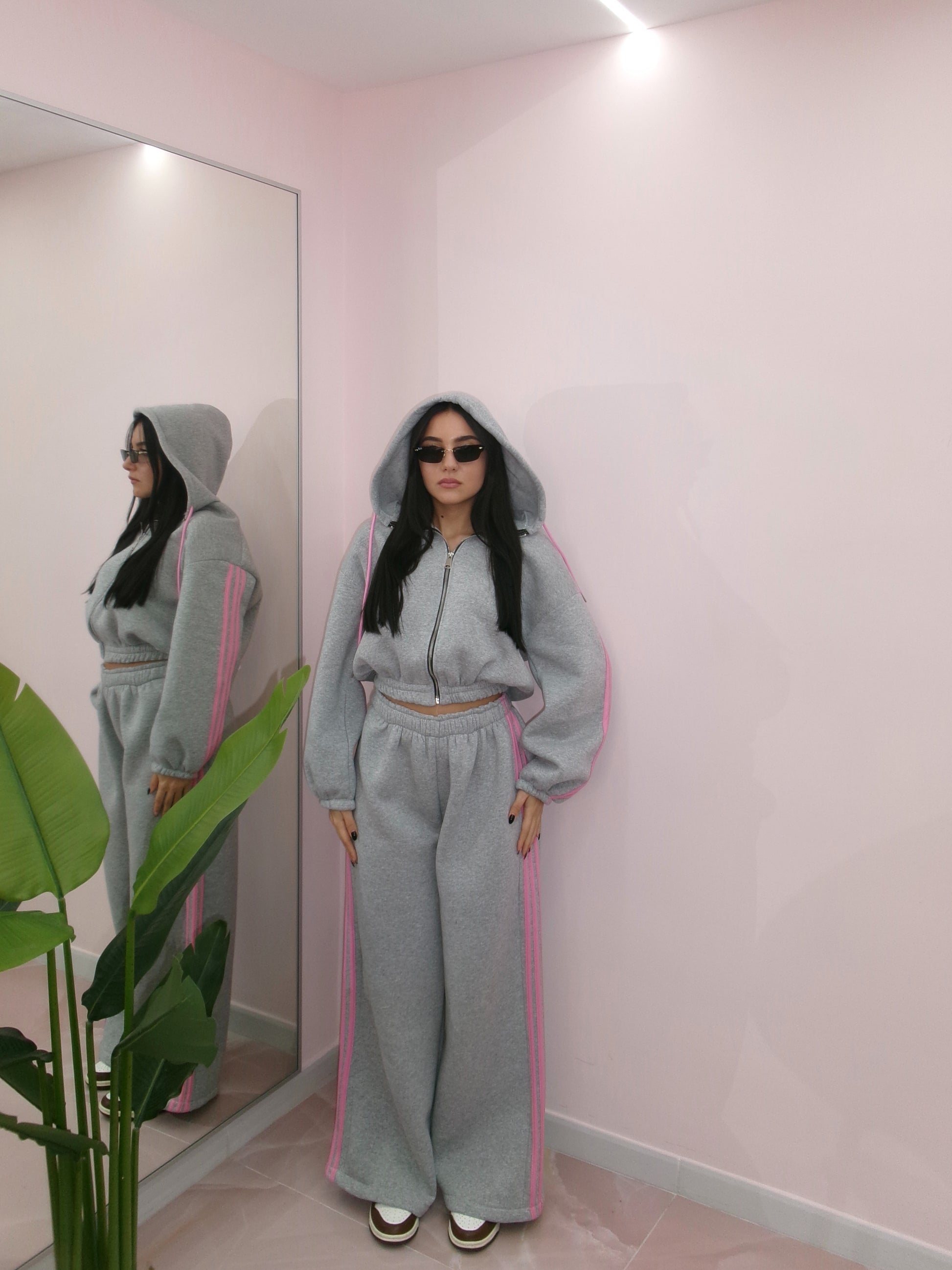 Taglia unica, veste da taglia XS a taglia XL. Composta da felpa con zip e cappuccio e pantalone palazzo con elastico in vita. Internamente felpata.
