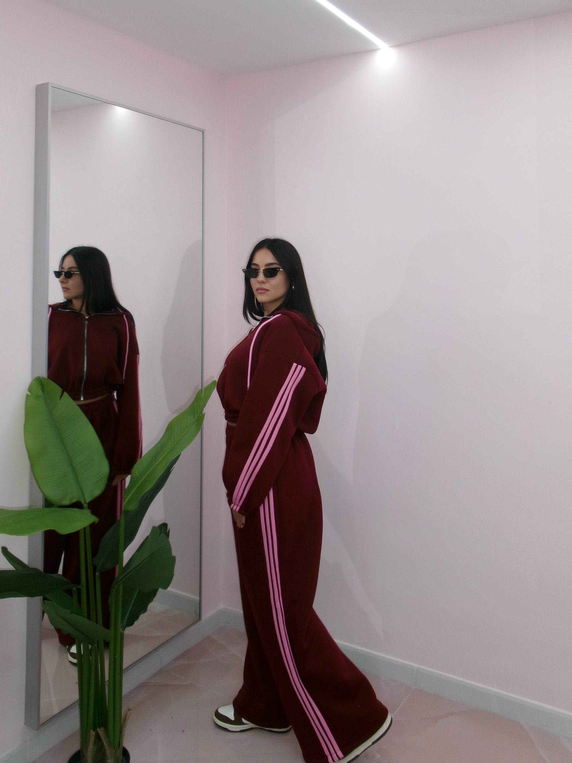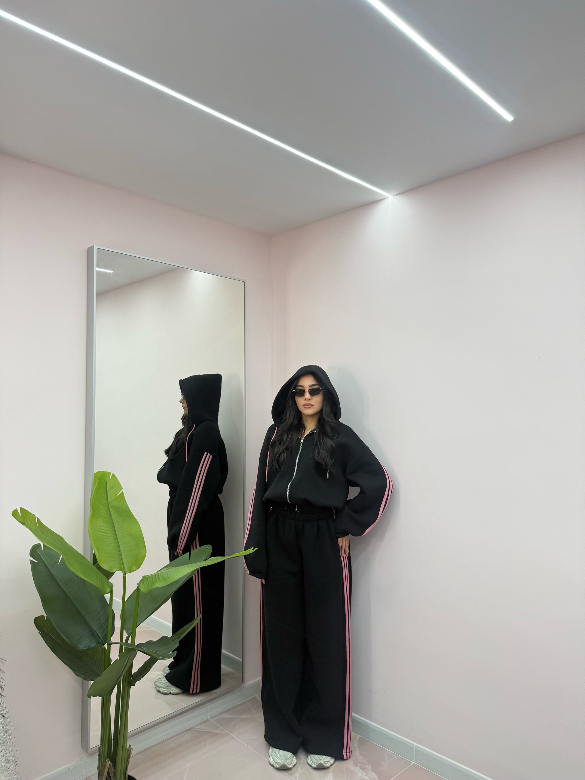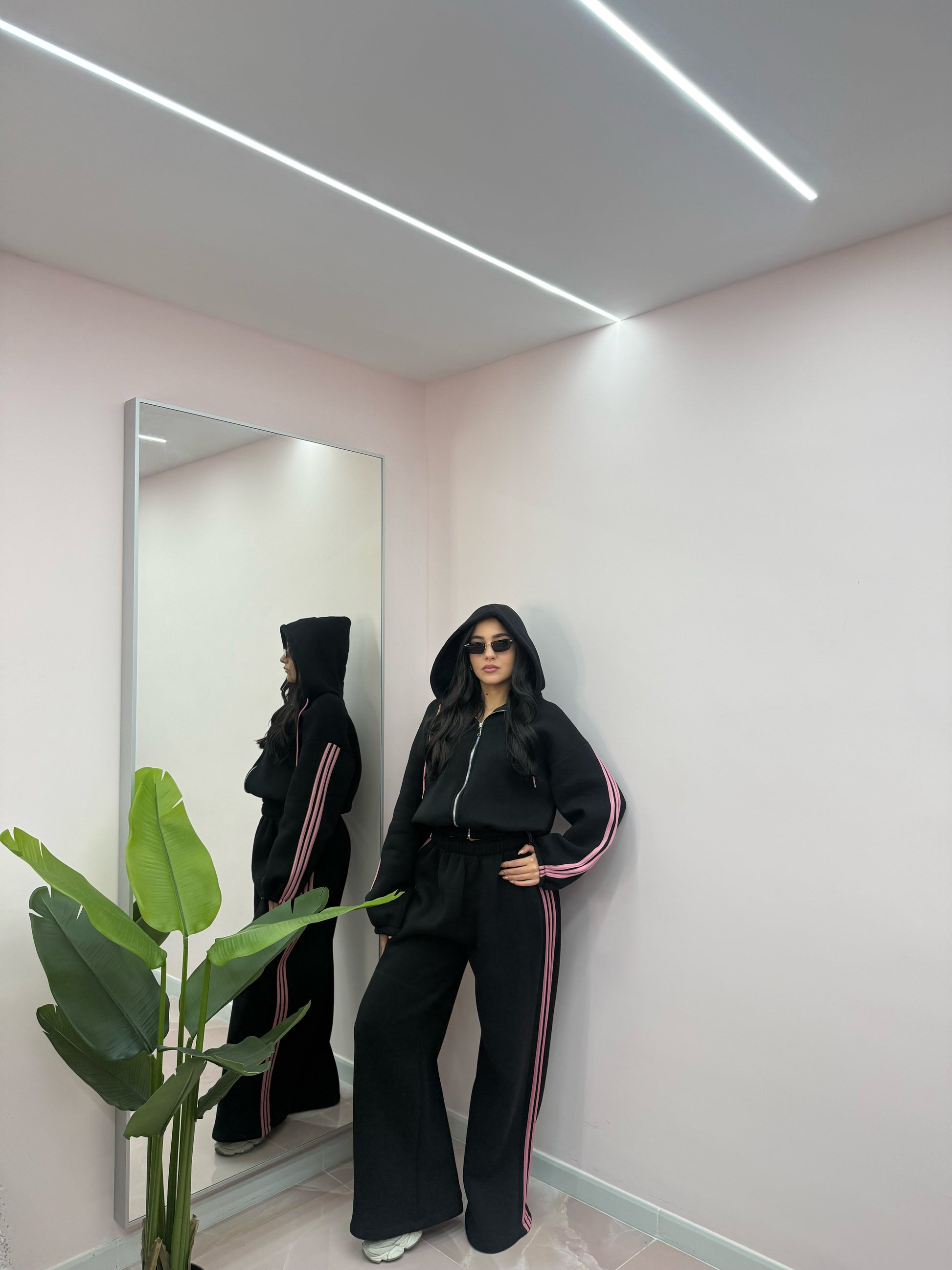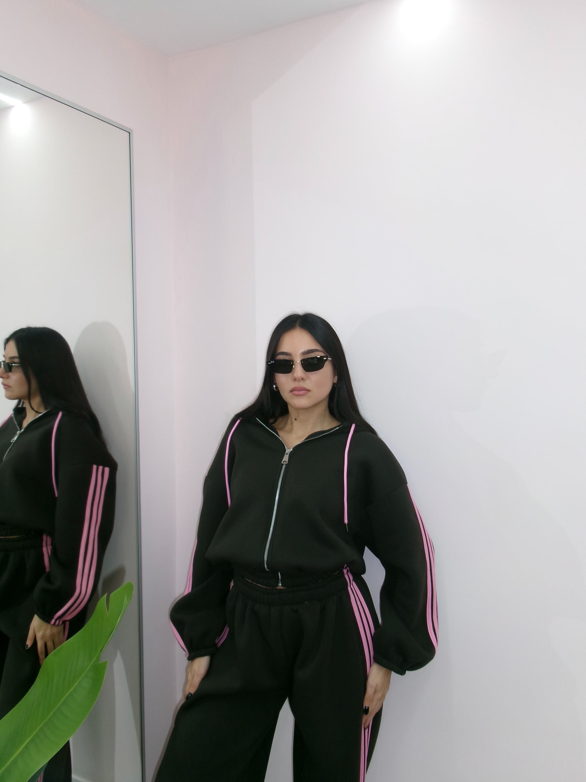 Taglia unica, veste da taglia XS a taglia XL. Composta da felpa con zip e cappuccio e pantalone palazzo con elastico in vita. Internamente felpata.